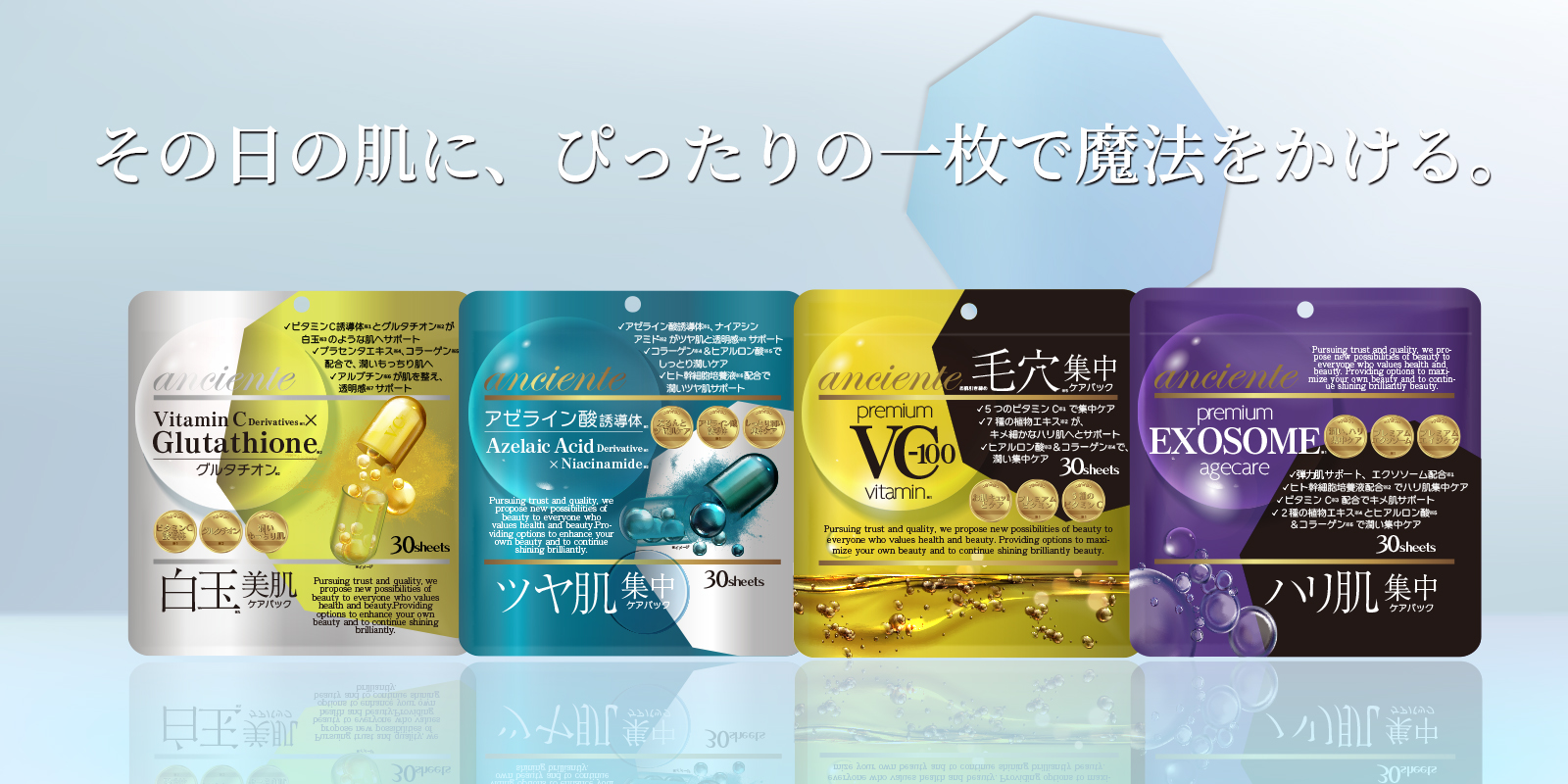 アンシャンテのフェイスパックシリーズは、ハリ・毛穴・ツヤ・透明感など、日によってゆらぐ大人の肌悩みに合わせて選べる4タイプのシートマスクです。