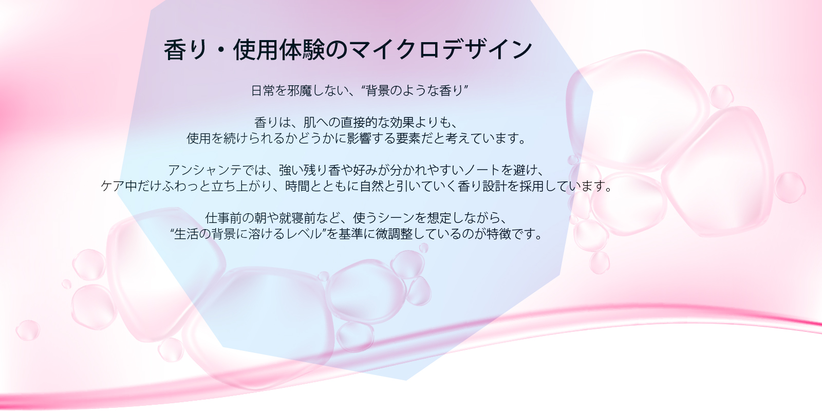 日々のライフスタイルの中で揺らぎやすい肌状態に寄り添い、質感や香り、使い心地まで丁寧に設計し、心地よいケア時間を提案します。