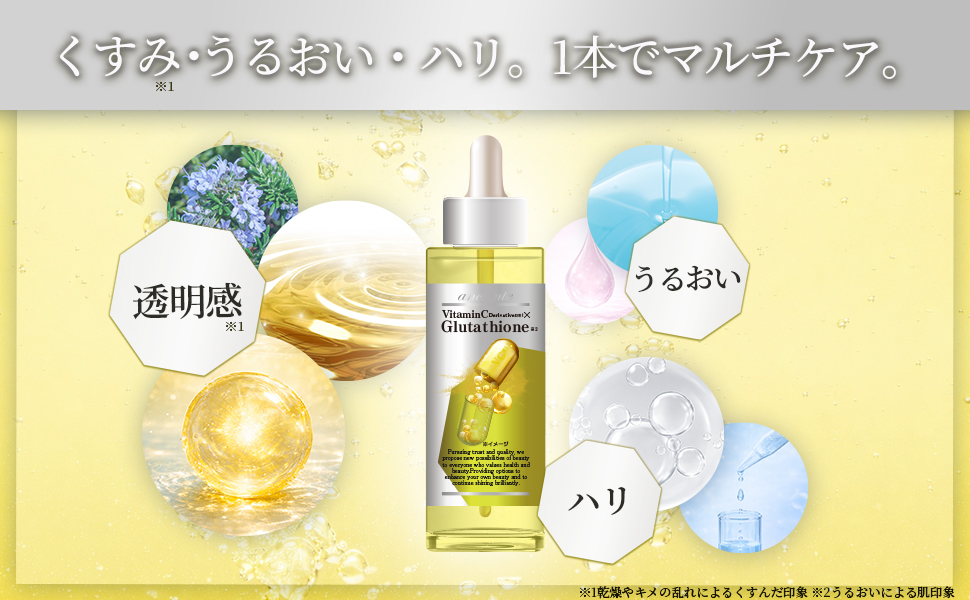 - グルタチオン×ビタミンC誘導体でぷるんと白玉肌※1へ。さらに、ナイアシンアミドやヒアルロン酸でうるおい、ハリまで、1本で全方位ケアができる美容液です。※1 うるおいによる肌印象