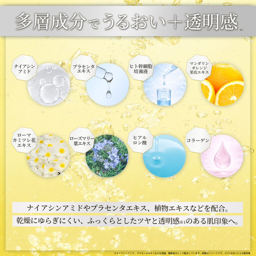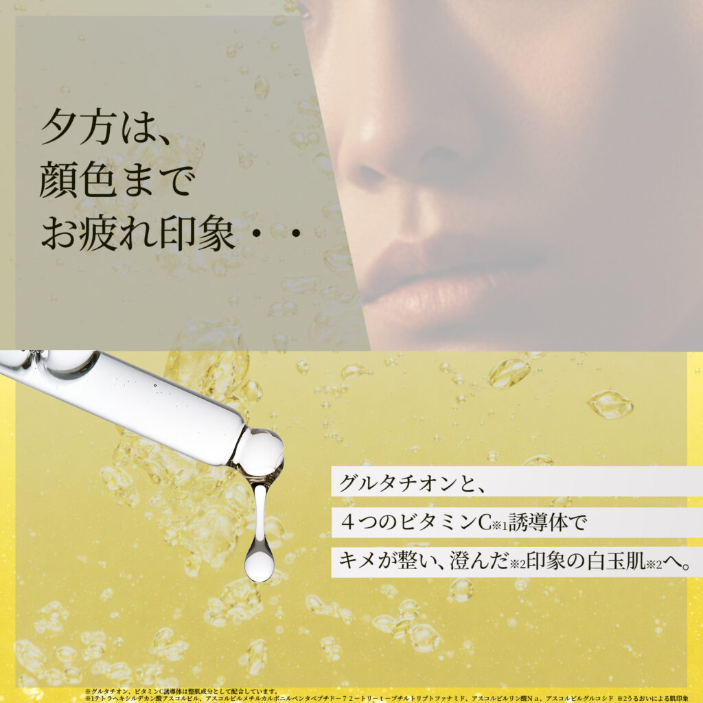 - くすみ※2・うるおい・ハリを1本でケアし、毎日の美容液習慣で、澄んだツヤのある白玉肌※1印象へ導きます。 ※1うるおいによる肌印象 ※2 乾燥やキメの乱れによる、くすんだ肌印象のこと